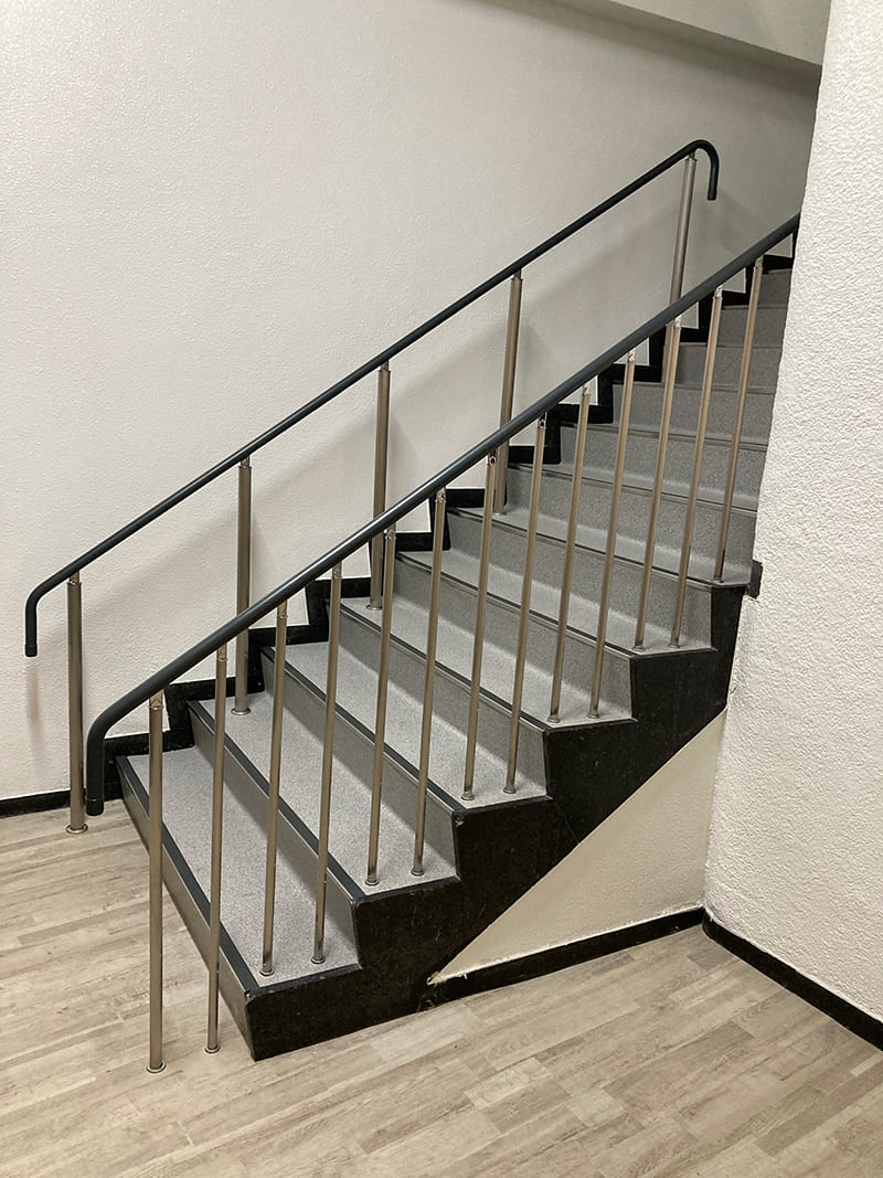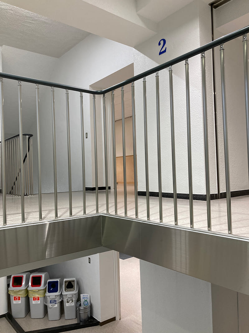 ステンの柱の上に樹脂手摺を取付するパターンです。階段にも対応出来ます。