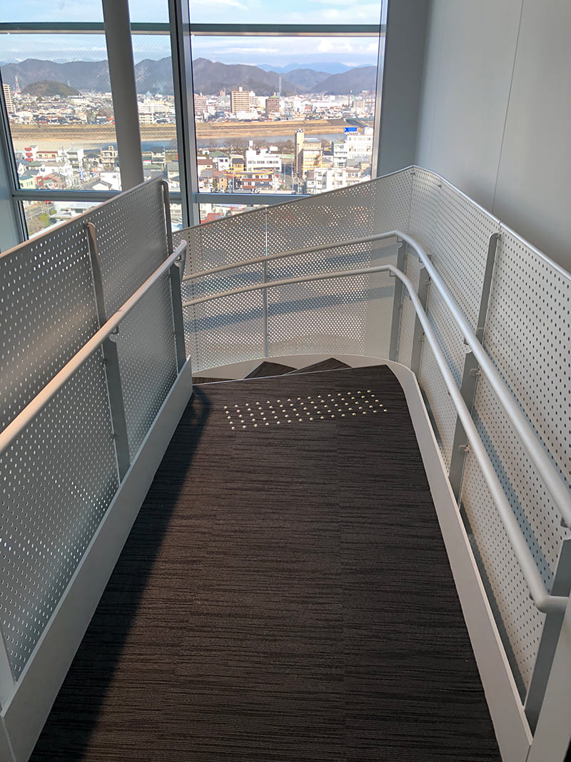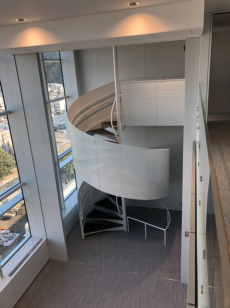 螺旋状に加工したスチール手摺に螺旋状に加工した壁パネルを取付しました。施工図も取付も苦労しました。