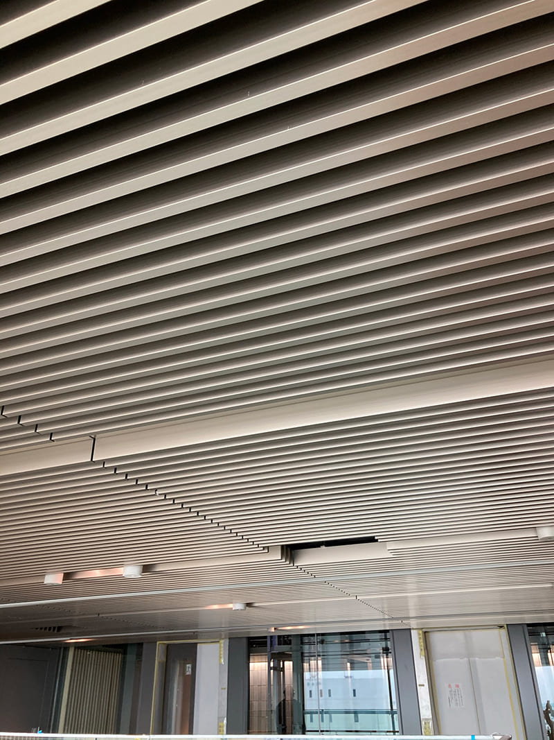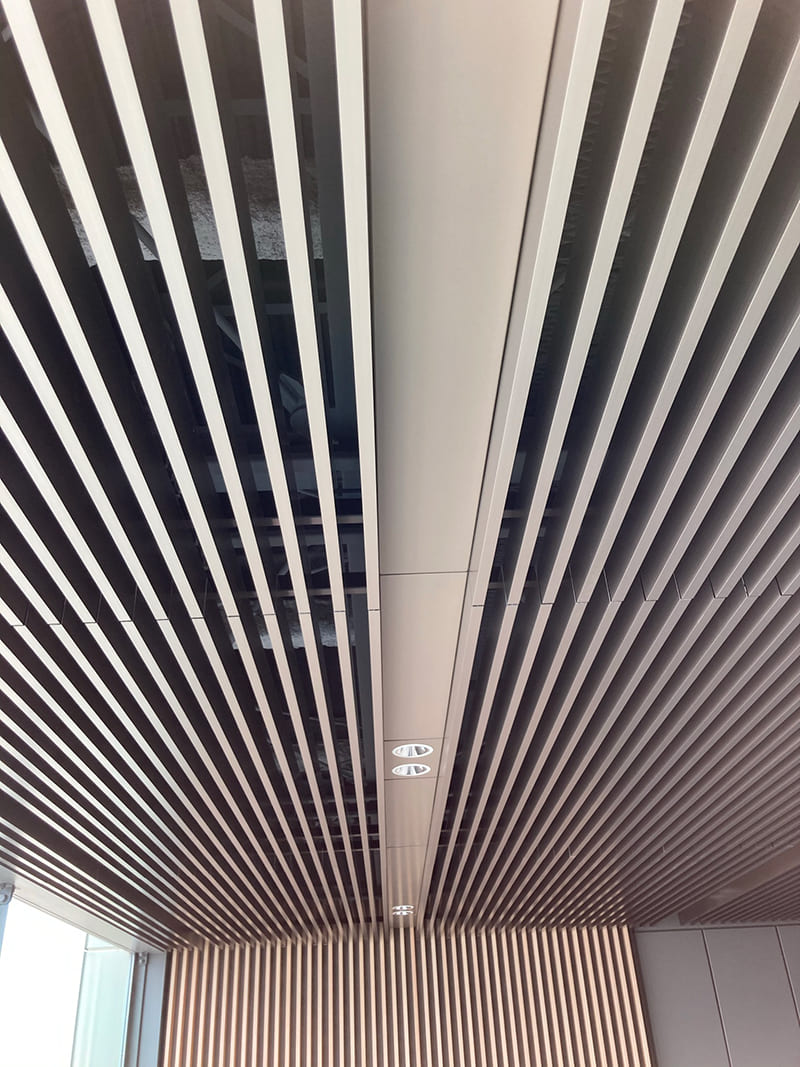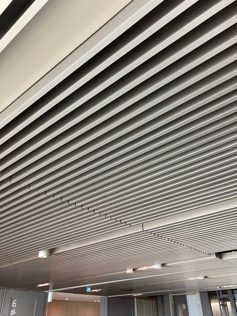 電解着色で塗装した天井ルーバーです。木目よりもメタリック感が出ます。